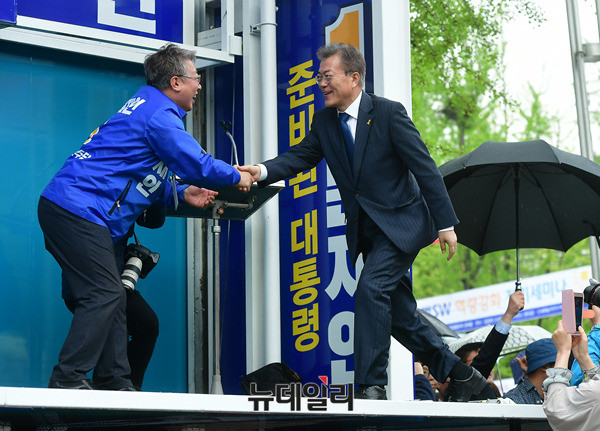 본격적인 대통령 선거 유세기간이 시작된 17일 오전 대구 북구 경북대학교 북문에서 문재인 더불어민주당 대선후보가 입장해 몰려든 지지자들과 악수를 나누고 있다. 이날 오전 2.28민주의거 기념탑 참배를 시작으로 대구에서 선거유세를 시작한 문 후보는 대전에 이어 수원과 서울을 각각 찾아 선거유세를 이어갈 예정이다. (대구=뉴데일리 정상윤 기자)