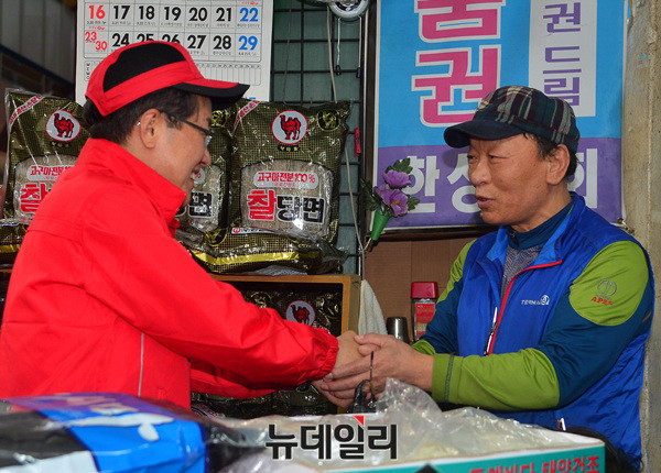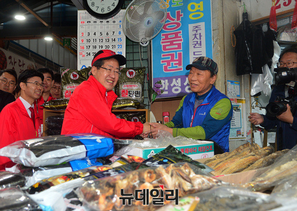 홍준표 자유한국당 대선후보가 17일 오전 대전 중앙시장을 방문해 상인과 악수를 나누고 있다 . 홍 후보는 이에 앞서 충남 아산에 위치한 현충사를 참배했다. 이어 대전·충남지역 공약을 발표한 후 대구·경북지역 유세에 나섰다. (대전=뉴데일리 공준표)