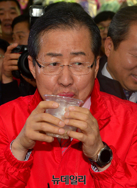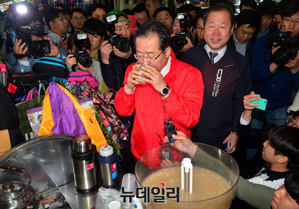 홍준표 자유한국당 대선후보가 17일 오전 대전 중앙시장을 방문해 한 상인에게 식혜를 건네받고 있다. 홍 후보는 이에 앞서 충남 아산에 위치한 현충사를 참배했다. 이어 대전·충남지역 공약을 발표한 후 대구·경북지역 유세에 나섰다. (대전=뉴데일리 공준표)