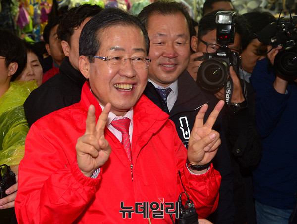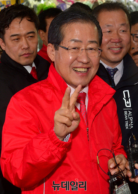 홍준표 자유한국당 대선후보가 17일 오전 대전 중앙시장을 방문해 브이 포즈를 하고 있다. 홍 후보는 이에 앞서 충남 아산에 위치한 현충사를 참배했다. 이어 대전·충남지역 공약을 발표한 후 대구·경북지역 유세에 나섰다. (대전=뉴데일리 공준표)