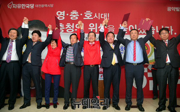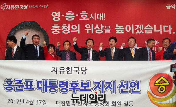 반기문 전 유엔사무총장 지지 단체 '대한민국 반사모(반기문을 사랑하는 사람들의 모임)'가 17일 오후 대전 중앙시장에서 열린 대전·충남지역 공약 발표장에서 홍준표 후보 지지를 공식 선언하고 있다. (대전=뉴데일리 공준표)