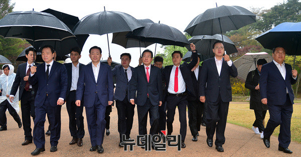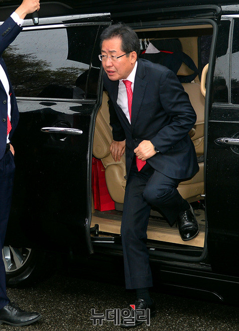 홍준표 자유한국당 대선후보가 17일 오전 충남 아산에 위치한 현충사를 참배하기 위해 차에서 내리고 있다. 이날 홍 후보는 참배를 마친 후 "백척간두의 위기에 처한 나라를 구한 충무공의 정신을 본받아 자유대한민국을 좌파의 손아귀에서 구해내겠다"며 방명록에 '死生決斷(사생결단)'이라고 휘호했다. (충남 아산=뉴데일리 공준표 기자)