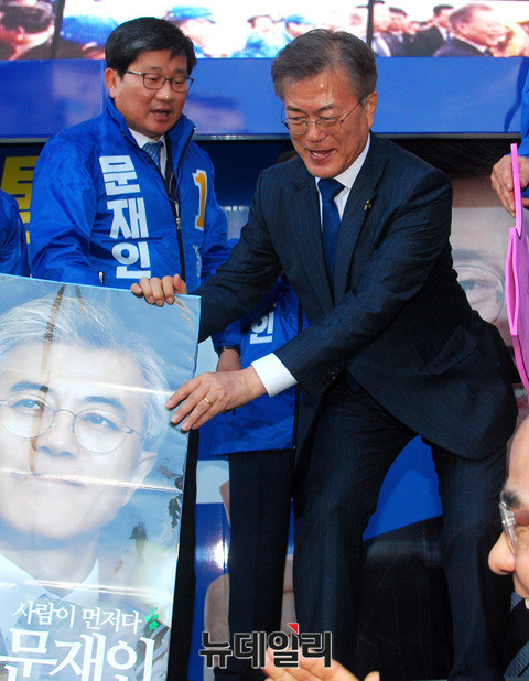문재인 더불어민주당 대선후보가 17일 오후 수원역 광장에서 열린 유세에서 지난 2012년 대선에사용한 벽보를 내리고 있다. 이날 오전 문 후보는 대구와 대전을 방문해 유세에 나섰다. (경기 수원=뉴데일리 공준표 기자)