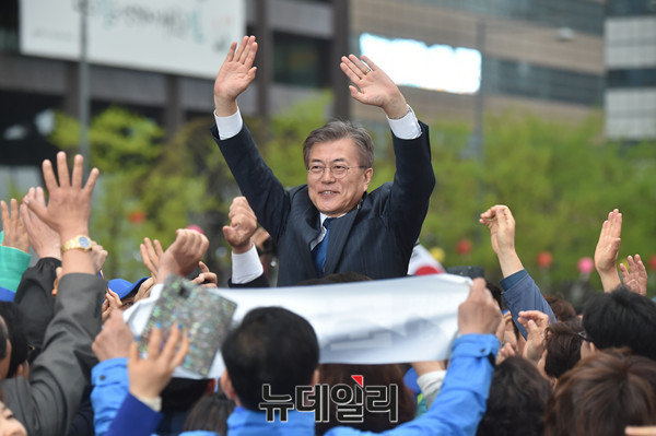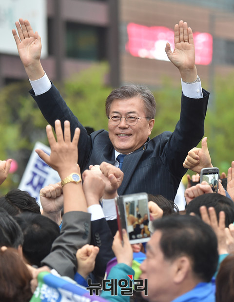 문재인 더불어민주당 대선후보가 17일 오후 서울 세종대로 광화문광장에서 집중 유세 중 지지자들에게 손을 들어 인사를 하고 있다.