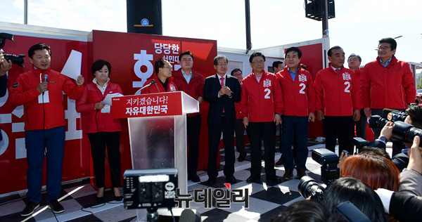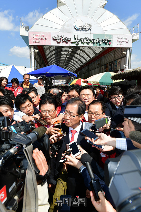 홍준표 자유한국당 대선후보가 18일 오전 울산 울주군 남창옹기종기시장을 찾아 취재진의 질문에 답하고 있다. 홍 후보는 부산, 마산, 진주를 각각 찾아 영남권에서 지지를 호소할 예정이다. (울산 울주=뉴데일리 정상윤 기자)