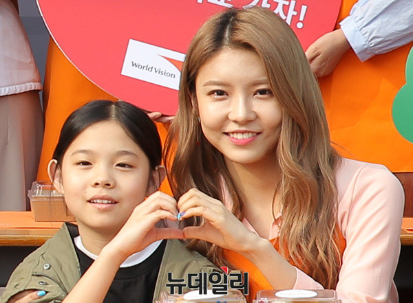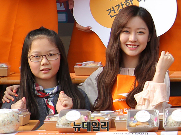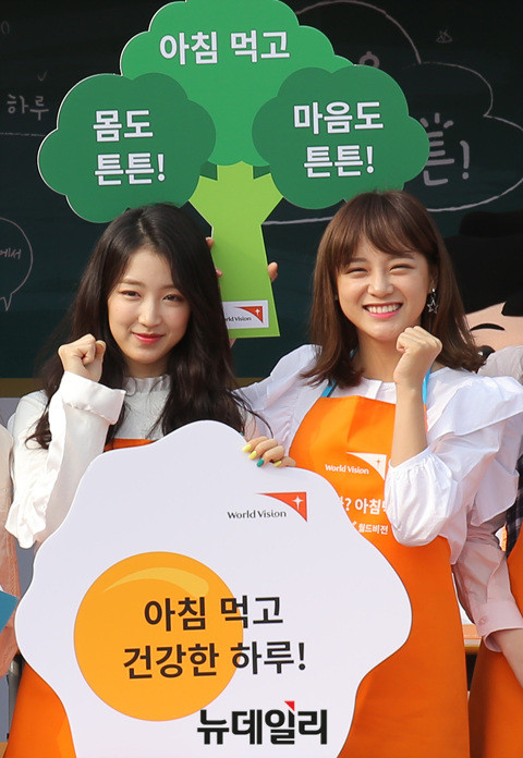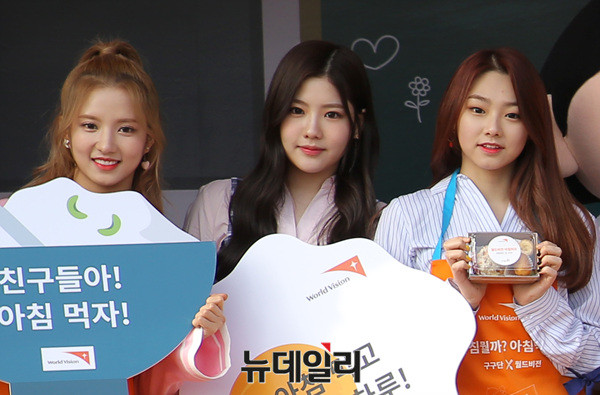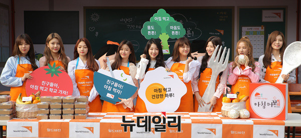 그룹 구구단(하나, 미미, 나영, 해빈, 세정, 소이, 샐리, 미나, 혜연)이 18일 오전 서울휘경초등학교에서 열린 월드비전(World Vision) 조식지원사업 '아침머꼬' 이벤트에 참석해 포즈를 취하고 있다.
