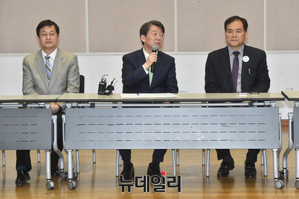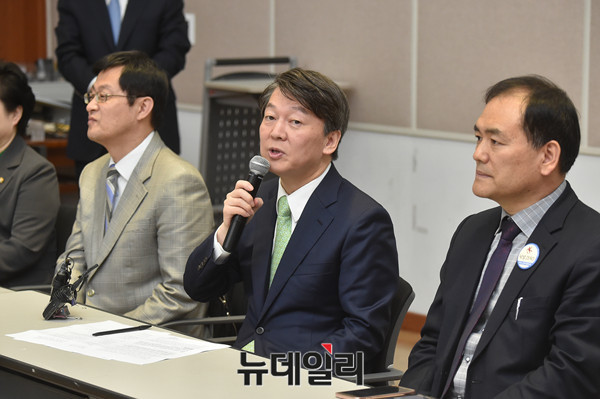 안철수 국민의당 대선후보가 18일 오전 대전 유성구 카이스트(KAIST)를 찾아 노인정책공약을 발표한 후 관계자들의 질문에 답하고 있다.(대전=뉴데일리 이종현 기자)