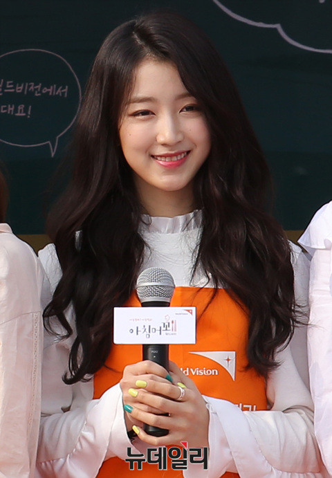 구구단(하나, 미미, 나영, 해빈, 세정, 소이, 샐리, 미나, 혜연) 하나가 18일 오전 서울휘경초등학교에서 열린 월드비전(World Vision) 조식지원사업 '아침머꼬' 이벤트에 참석해 미소 짓고 있다.