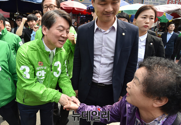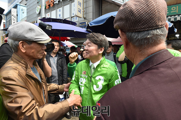 안철수 국민의당 대선후보가 18일 오전 대전 동구 중앙시장 앞에서 열린 대전 국민승리유세에서 시민들과 인사를 나누고 있다. (대전=뉴데일리 이종현 기자)