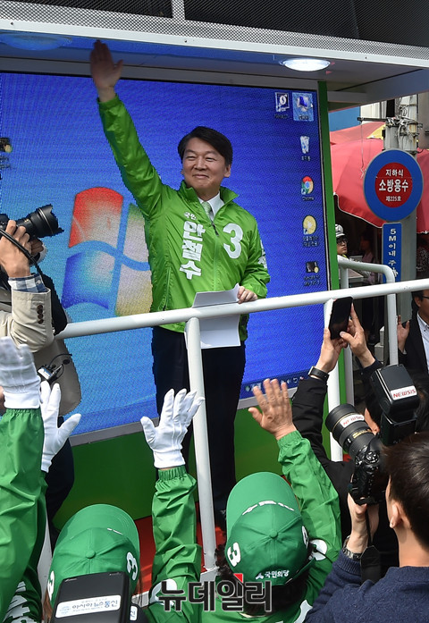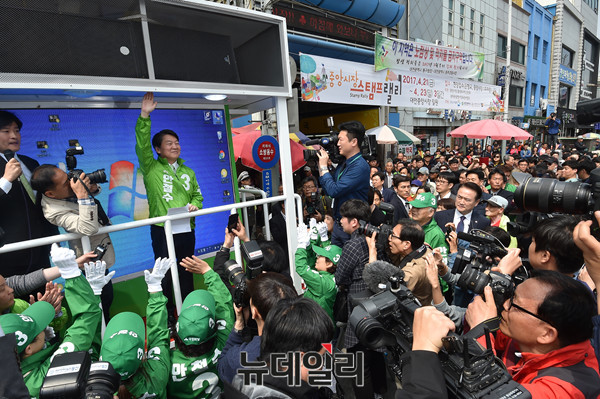 안철수 국민의당 대선후보가 18일 오전 대전 동구 중앙시장 앞에서 열린 대전 국민승리유세에서 손을 들어 인사하고 있다. (대전=뉴데일리 이종현 기자)