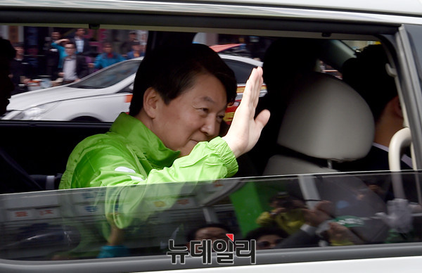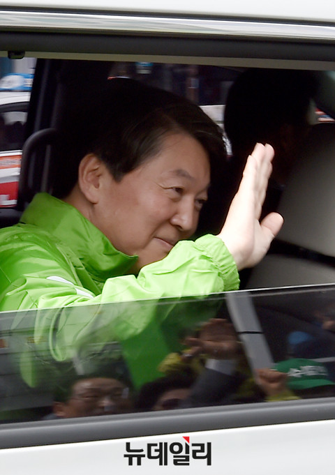 안철수 국민의당 대선후보가 18일 오전 대전 동구 중앙시장 앞에서 열린 대전 국민승리유세를 끝내고 차량으로 이동중 손을 흔들어 시민들에게 인사하고 있다. (대젼=뉴데일리 이종현 기자)
