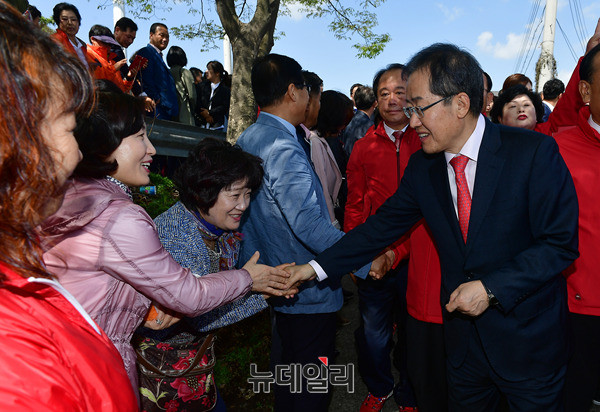 홍준표 자유한국당 대선후보가 18일 오전 울산 울주군 남창옹기종기시장을 찾아 시민들에게 인사를 나누고 있다. 홍 후보는 "나라가 안전하고 튼튼하고, 대한민국 70%에 달하는 서민들이 행복한 나라를 만들어보도록 하겠다"며 지지를 호소했다. 홍 후보는 이날 부산, 마산, 진주를 각각 찾아 영남권에서 지지를 호소할 예정이다. (울산 울주=뉴데일리 정상윤 기자)