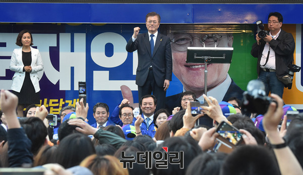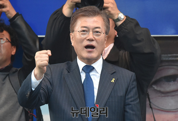더불어민주당 문재인 대선후보가 18일 오후 광주 동구 금남로에서 열린 집중유세에서 '임의 위한 행진곡'을 부르고 있다. (광주=뉴데일리 이종현 기자)