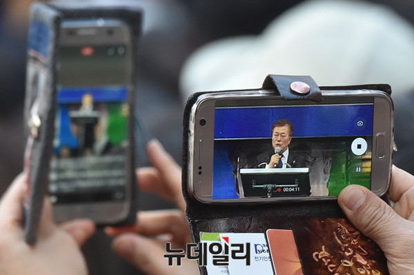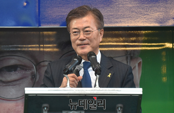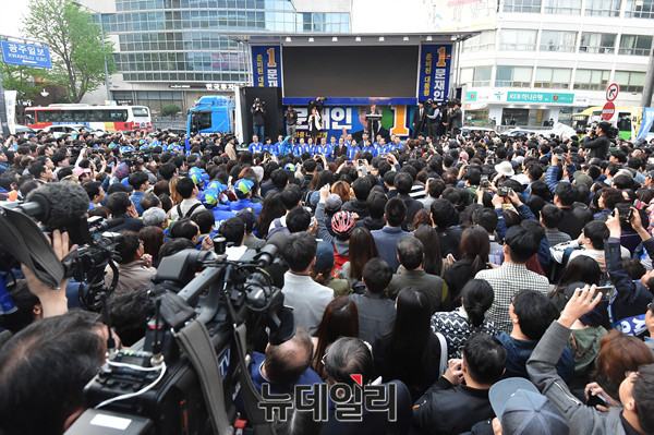 더불어민주당 문재인 대선후보가 18일 오후 광주 동구 금남로에서 열린 집중유세에서 지지를 호소하고 있다. (광주=뉴데일리 이종현 기자)