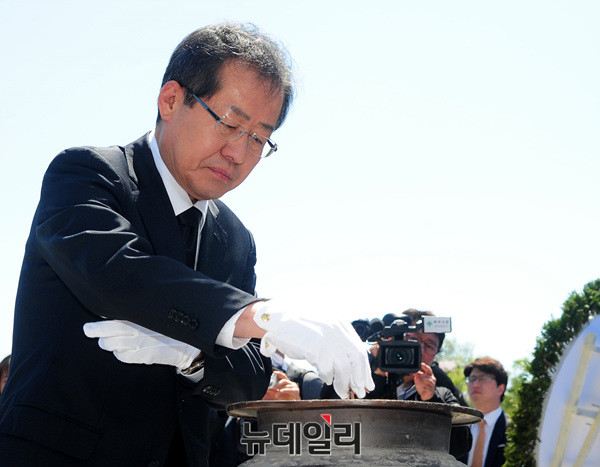 홍준표 자유한국당 대선후보가 19일 오전 서울 강북구 국립 4.19 민주묘지를 찾아 분향하고 있다.
