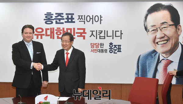 자유한국당 홍준표 대통령 후보가 19일 오후 서울 여의도 당사에서 마크내퍼 주한미국대사 대리 예방을 받고 있다.