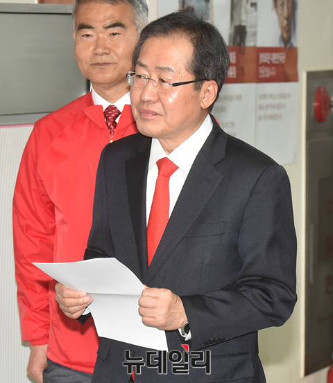 자유한국당 홍준표 대통령 후보가 19일 오후 서울 여의도 당사 기자실에서 '안보 독트린'을 발표하기 위해 입장하고 있다.