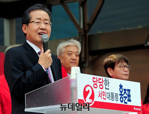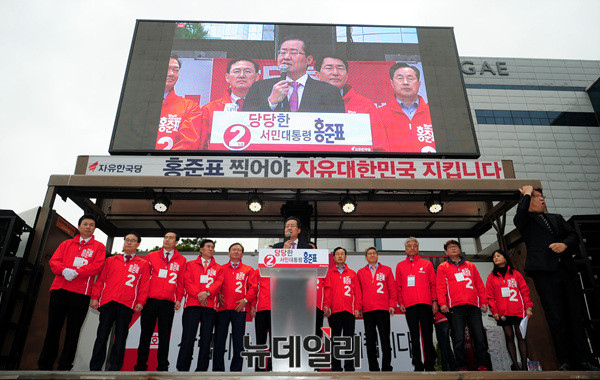홍준표 자유한국당 대선후보가 20일 오전 인천종합터미널광장에서 집중유세를 하고 있다. 홍 후보는 앞서 경인항 통합운영센터전망대에서 SOC(사회간접자본)뉴딜정책을 발표했다. 이어 모래내시장을 방문해 유세를 펼친 뒤 평택 해군2함대에서 안보공약을 발표할 예정이다. (인천=뉴데일리 공준표 기자)
