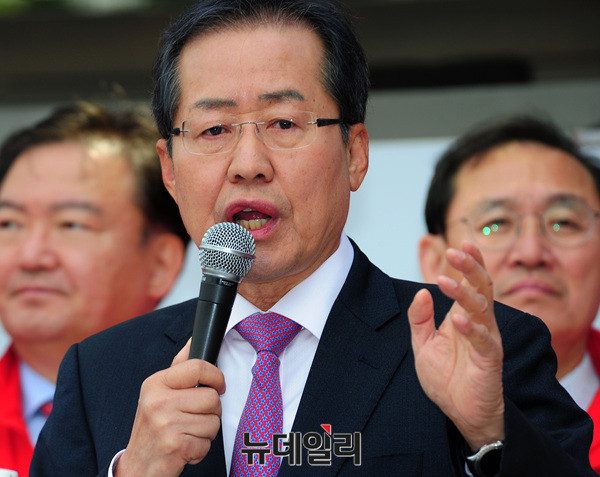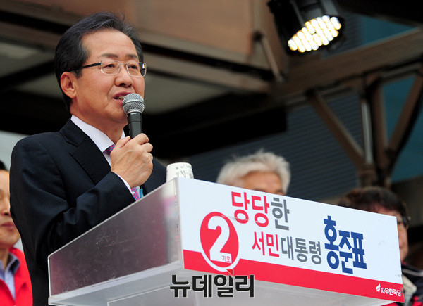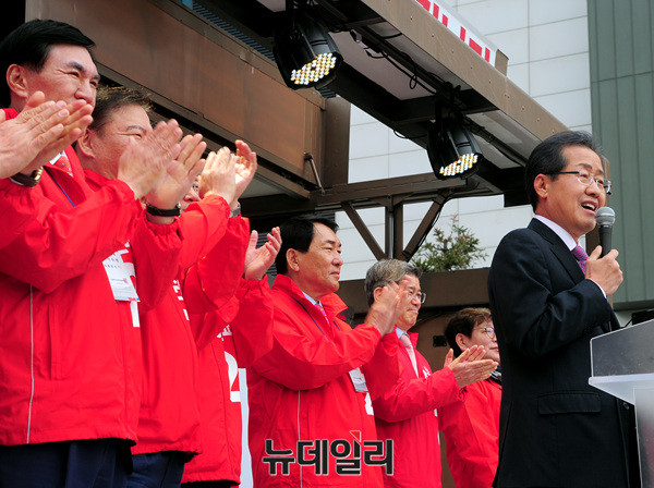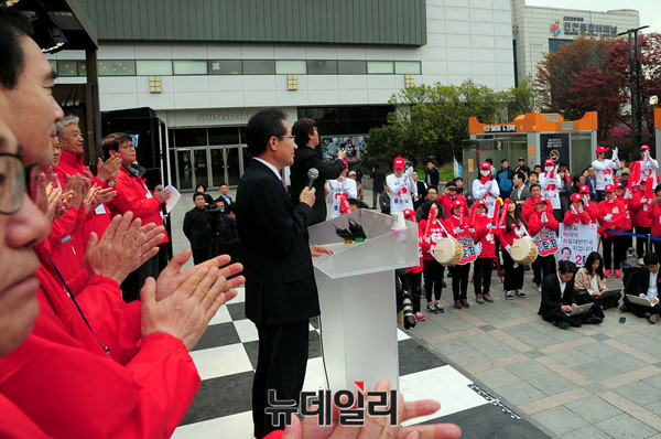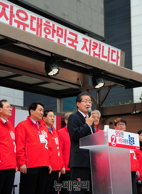 홍준표 자유한국당 대선후보가 20일 오전 인천종합터미널광장에서 연설하고 있다.홍 후보는 앞서 경인항 통합운영센터전망대에서 SOC(사회간접자본)뉴딜정책을 발표했다. 이어 모래내시장을 방문해 유세를 펼친 뒤 평택 해군2함대에서 안보공약을 발표할 예정이다. (인천=뉴데일리 공준표 기자)