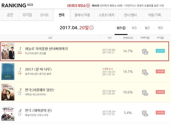 연극 '선녀씨 이야기'가 예매순위 1위를 석권했다.'선녀씨이야기'는 20일 인터파크 티켓 사이트 내 연극 카테고리에서 일간 예매율 랭킹에서 1위를 차지하며 기대작임을 입증했다.2013년 초연된 '선녀씨 이야기'는 작가이자 연출을 맡은 이삼우 감독이 자신의 어머니 이야기를 바탕으로 만든 작품. 15년을 밖으로 떠돌다 영정사진 앞에 선 아들 종우의 시선에서 바라본 어머니 선녀씨의 삶과 현대 가족사회의 이면을 보여준다.경남 거제 지역 유일의 연극단체인 예도의 대표 창작품으로, 2012년 전국연극제 대상과 희곡상, 연출상 등 5관왕을 수상했다. 이번 시즌에는 국민배우 최수종(종우 役)을 비롯해 선우용여(어머니 선녀 役), 윤해영(젊은 선녀 役), 한갑수(아버지 役) 등이 원캐스트로 출연한다.연극 '선녀씨 이야기'는 5월 6일부터 21일까지 두산아트센터 연강홀에서 공연된다. 관람료 7만7천~8만8천원. 문의 02-1670-7018.