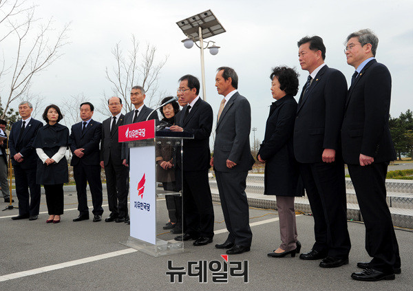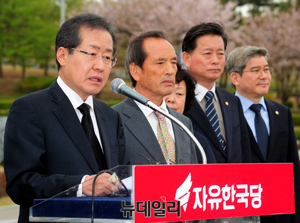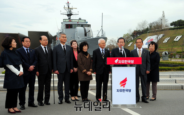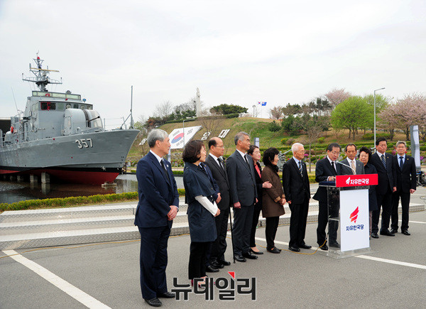 홍준표 자유한국당 대선후보가 20일 오후 경기 평택 해군 2함대를 방문해 서해교전으로 침몰한 고속정 참수리 357호 앞에서 보훈·안보 공약을 발표하고 있다.