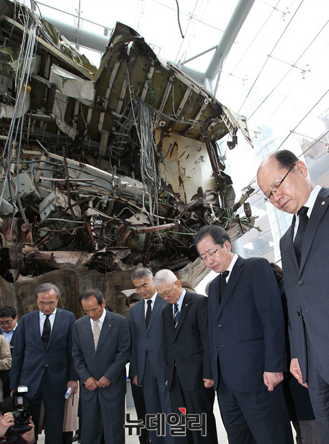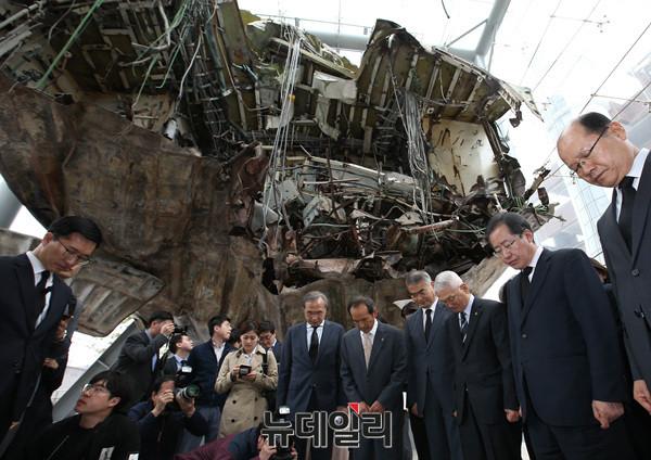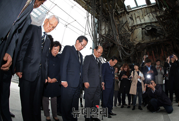 홍준표 자유한국당 대선후보가 20일 오후 경기 평택 해군 2함대를 찾아 지난 2010년 북한 잠수함의 어뢰 공격으로 침몰당한 천안함을 방문해 묵념하고 있다.