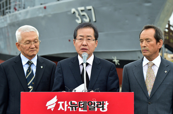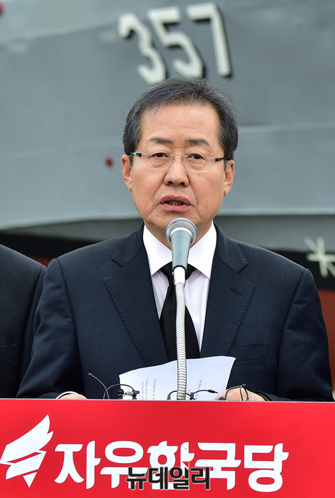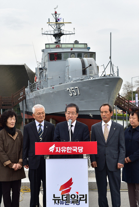 홍준표 자유한국당 대선후보가 20일 오후 경기 평택 해군 2함대를 방문해 서해교전으로 침몰한 고속정 참수리 357호 앞에서 발언하고 있다.
