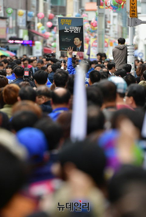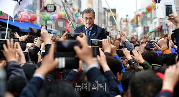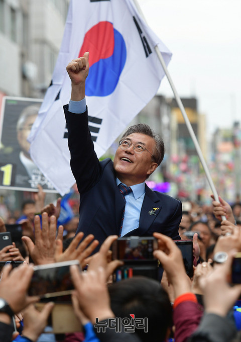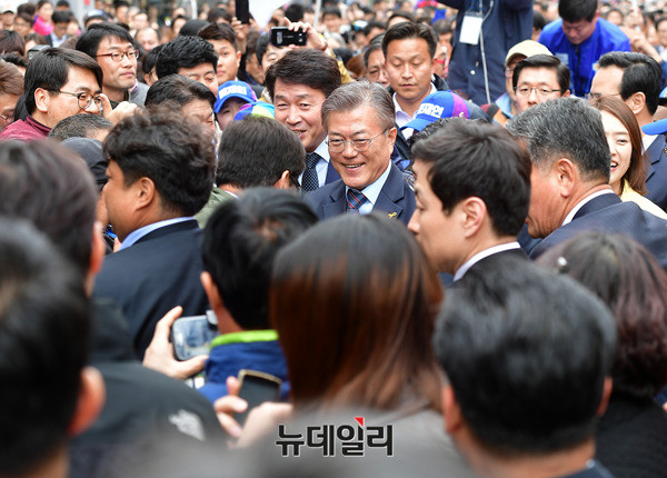 문재인 더불어민주당 대선후보가 20일 오후 강원 원주시 KB국민은행 원주지점 앞에서 열린 유세에 입장하며 단상에 올라 엄지를 치켜들고 있다. 문 후보는 이날 춘천, 원주, 청주를 찾아 유세를 이어간다. (강원 원주=뉴데일리 정상윤 기자)
