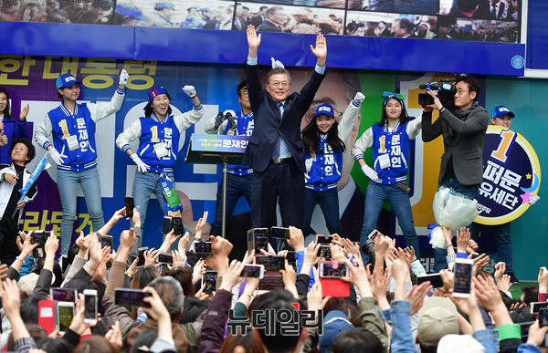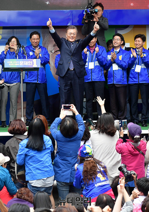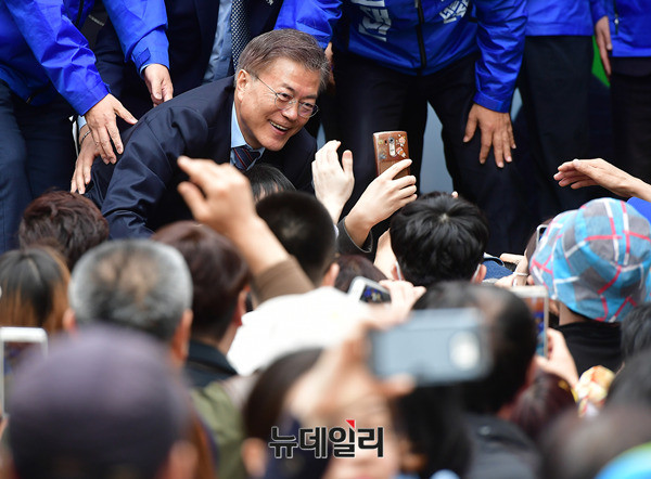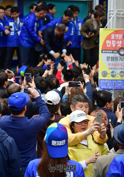 문재인 더불어민주당 대선후보의 지지자가 20일 오후 강원 원주시 KB국민은행 원주지점 앞에서 열린 유세에서 문 후보를 배경으로 기념사진을 찍고 있다. 문 후보는 이날 춘천, 원주, 청주를 찾아 유세를 이어간다. (강원 원주=뉴데일리 정상윤 기자)
