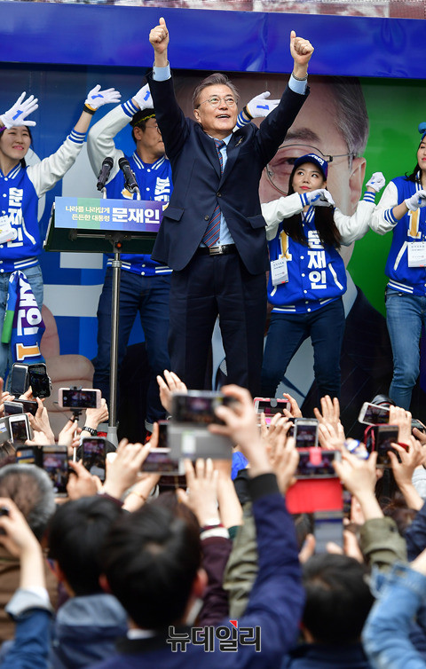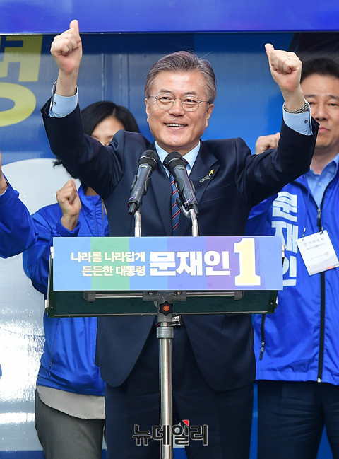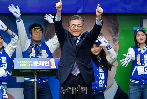 문재인 더불어민주당 대선후보가 20일 오후 강원 원주시 KB국민은행 원주지점 앞에서 열린 유세에서 지지자들의 환호에 엄지를 들어 화답하고 있다. 문 후보는 이날 춘천, 원주, 청주를 찾아 유세를 이어간다. (강원 원주=뉴데일리 정상윤 기자)