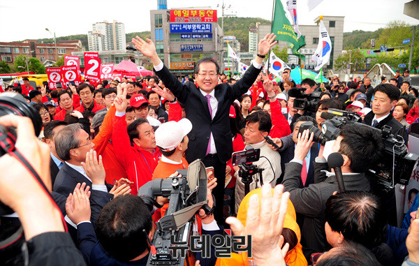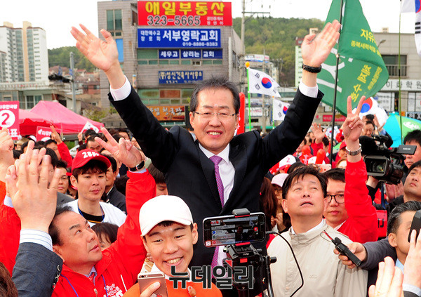 홍준표 자유한국당 대선후보가 20일 오후 용인 중앙시장에서 연설을 후 지지자들에게 둘러싸여 만세를 하고 있다. 홍 후보는 앞서 평택 해군 2함대를 방문해 천안함과 참수리호를 둘러보고 보훈·안보 공약을 발표했다. 이어 수원 지동시장을 방문할 예정이다. (경기 용인=뉴데일리 공준표 기자)