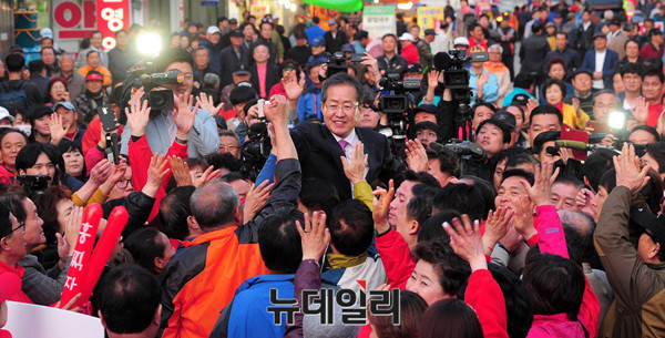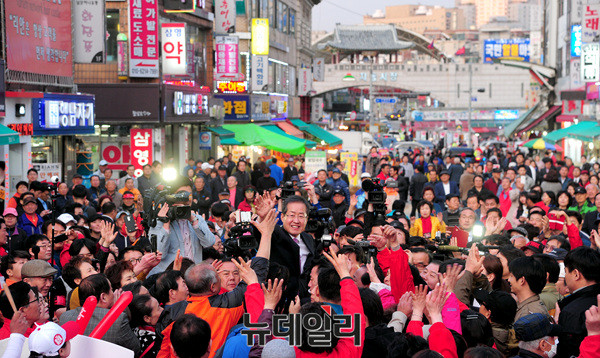 홍준표 자유한국당 대선후보가 20일 오후 수원 지동시장 앞 광장에서 연설을 마친 후 지지자들 속에서 손을 들어보이고 있다. 홍 후보는 이에 앞서 용인 중앙시장을 방문해 유세에 나섰다. (경기 수원=뉴데일리 공준표 기자)