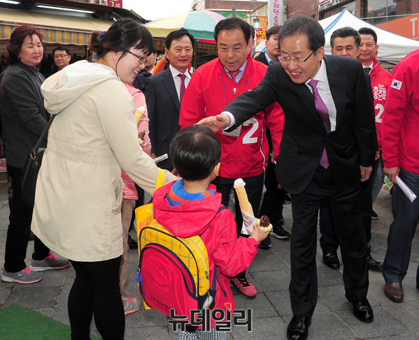 홍준표 자유한국당 대선후보가 20일 오후 용인 중앙시장에서 연설 후 한 어린이의 머리를 쓰다듬고 있다. 홍 후보는 앞서 평택 해군 2함대를 방문해 천안함과 참수리호를 둘러보고 보훈·안보 공약을 발표했다. 이어 수원 지동시장에서 유세에 나섰다. (경기 용인=뉴데일리 공준표 기자)