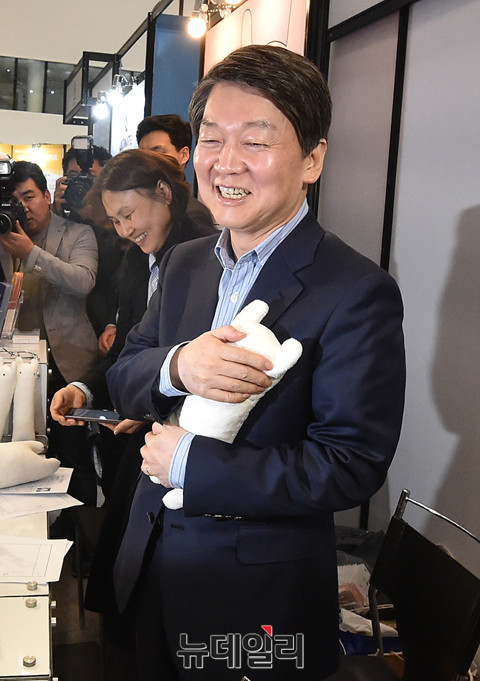 안철수 국민의당 대선후보가 20일 오후 서울 동대문디자인플라자에서 열린 산업기술 유망기업 채용, 창업박람회에서 선물 받은 인형을 들어 보이고 있다.