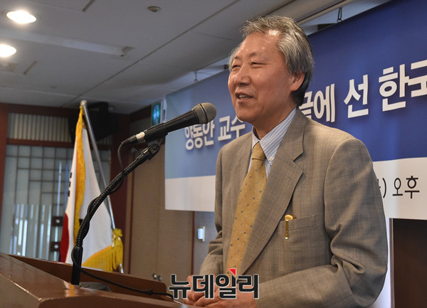 '벼랑 끝에 선 한국의 자유민주주의' 출판기념회가 21일 오후 서울 중구 프레스센터에서 열린 가운데 저자 양동안 교수가 발언을 하고 있다.<벼랑 끝에 선 한국의 자유민주주의 저자 양동안 교수 약력>1945년 전남 순천 출생1968년 서울대 정치학과 졸업1990년까지 언론/학계 두 영역서 활동합동통신 기자. 경향신문/세계일보 논설위원 역임.조선대 전임강사-경기대 부교수 거쳐 한국학중앙연구원 교수 역임2009 퇴임 후 현재 한국학 중앙연구원 명예교수