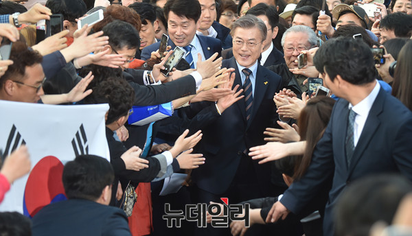 문재인 더불어민주당 대선후보가 21일 오후 인천 부평구 부평역 앞 광장에서 열린 집중유세에서 시민들과 하이파이브를 하고 있다.