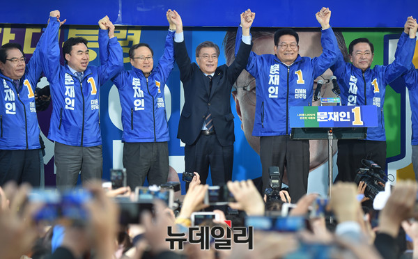 문재인 더불어민주당 대선후보가 21일 오후 인천 부평구 부평역 앞 광장에서 열린 집중유세에서 손을 들어 인사를 하고 있다.