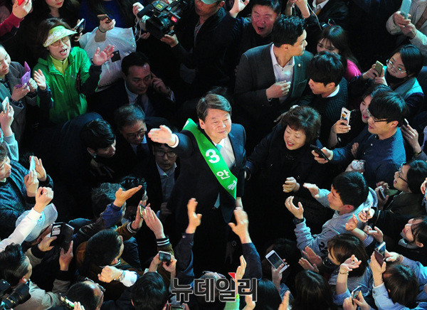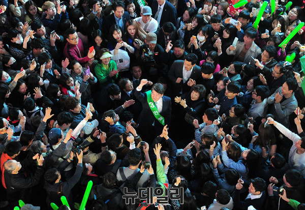 안철수 국민의당 대선후보가 21일 오후 부산 부산진구 서면에서 유세에 앞서 시민들 속에서 만세를 하고 있다. 안 후보는 앞서 울산 그린카 기술센터를 방문해 울산형 연구기반단지를 조성하겠다는 공약을 발표한 후 울산 남구에 위치한 롯데호텔 앞에서 유세에 나섰다. (부산=뉴데일리 공준표 기자)