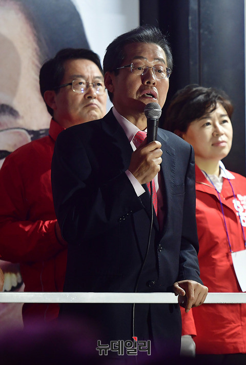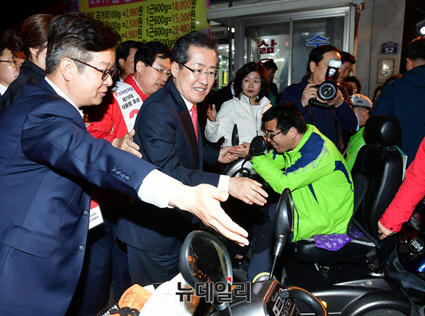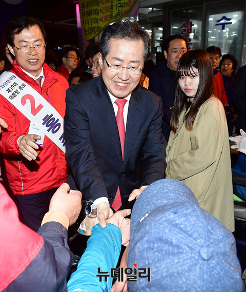 홍준표 자유한국당 대선후보가 21일 오후 경북 영천공설시장을 찾아 지지를 호소하고, "대통령이 되면 김정은 무릎을 꿇리겠다"고 말했다. 홍 후보는 이날 오전 한국프레스센터에서 열린 관훈토론회 직후 포항과 경주, 영천을 각각 찾아 유세를 이어갔다. (경북 영천=뉴데일리 정상윤 기자)