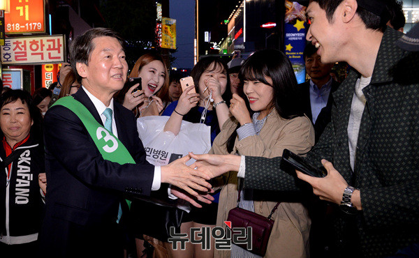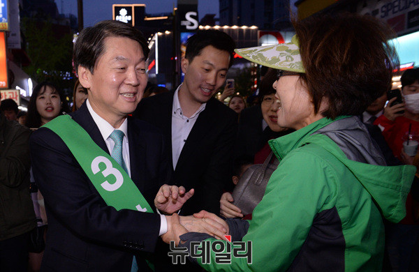 안철수 국민의당 대선후보가 21일 오후 부산 부산진구 서면에서 유세 후 시민들과 악수를 나누고 있다. 안 후보는 앞서 울산 그린카 기술센터를 방문해 울산형 연구기반단지를 조성하겠다는 공약을 발표한 후 울산 남구에 위치한 롯데호텔 앞에서 유세에 나섰다. (부산=뉴데일리 공준표 기자)(사진=공동취재단)
