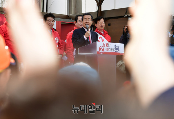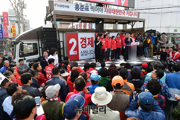 홍준표 자유한국당 대선후보가 21일 오후 경북 포항시 죽도시장을 찾아 지지를 호소하고 있다. 홍 후보는 이날 오전 한국프레스센터에서 열린 관훈토론회 직후 포항을 찾았다. 이어 경북 경주와 영천을 각각 방문해 지지를 호소했다.