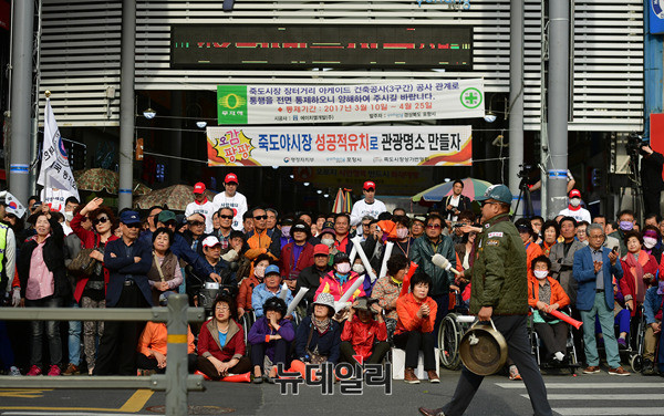 죽도시장에서 열린 유세에는 백승주 경북선거대책위원장, 강석호 선대위 유세지원본부장, 박명재, 이만희 의원, 김명연 선대위 수석대변인, 김정재 선대위 대변인, 김대식 후보수행단장 등이 참석해 홍 후보의 유세를 도왔다. (경북 포항=뉴데일리 정상윤 기자)