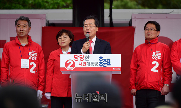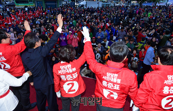 홍준표 자유한국당 대선후보가 21일 오후 경북 경주역 광장에서 집중유세를 직후 모인 시민들에게 큰절을 올리고 있다. 홍 후보는 "우리 영남이 뭉치기 시작했고, 강원·충청이 뭉치기 시작했다"며 지지를 호소했다. 홍 후보는 이날 오전 한국프레스센터에서 열린 관훈토론회 직후 포항을 찾았다. 이어 경북 경주와 영천을 각각 방문해 지지를 호소했다. (경북 경주=뉴데일리 정상윤 기자)
