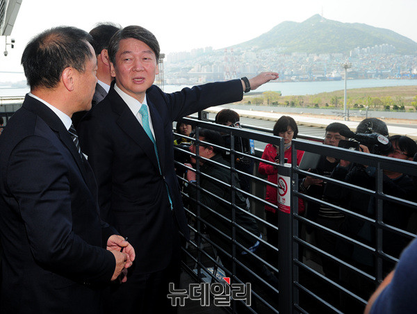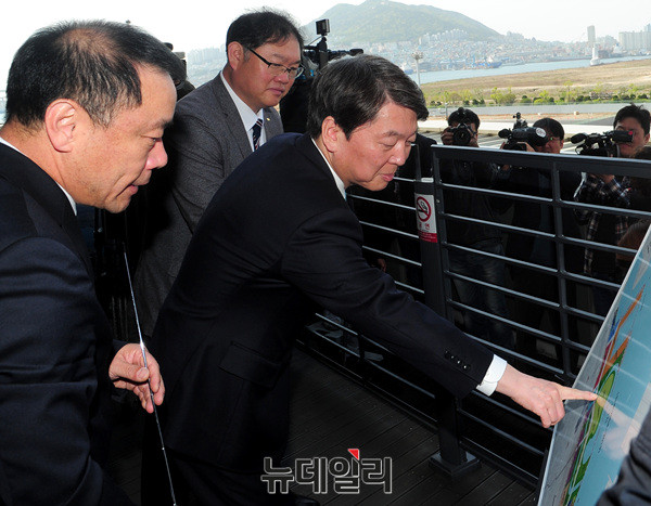 안철수 국민의당 대선후보가 22일 오전 부산항 국제여객터미널을 방문해 북항(부산항) 재개발현장을 둘러보고 있다.안 후보는 이어 창원 소답시장, 마산어시장에서 유세 후 김해 봉하마을을 방문해 노무현 전 대통령 묘역에 참배할 예정이다. (부산=뉴데일리 공준표 기자)