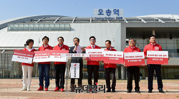 • 홍준표 자유한국당 대선후보가 22일 오전 충북 청주시 오송역 광장에서 충북지역 공약을 발표하고 있다. 이날 발표한 공약은 △오송역 광역복합환승센터 건립 △서울~세종고속도로 청주시 경유 △중부내륙선 철도 복선화 및 수도권 전철화 △충북 산림 휴양밸리 조성 △오송 BIO 특화단지 조성 △청주국제공항 경쟁력 강화 및 연계교통망 확충 등이다.