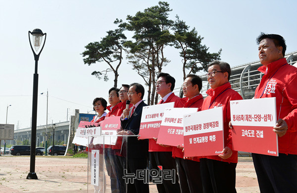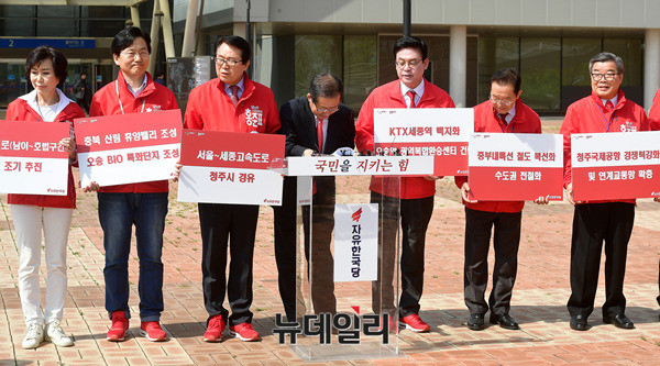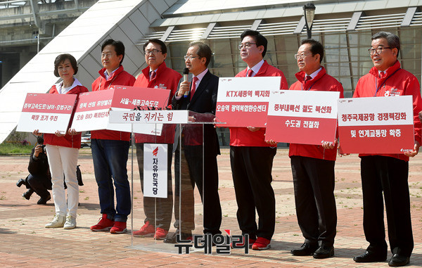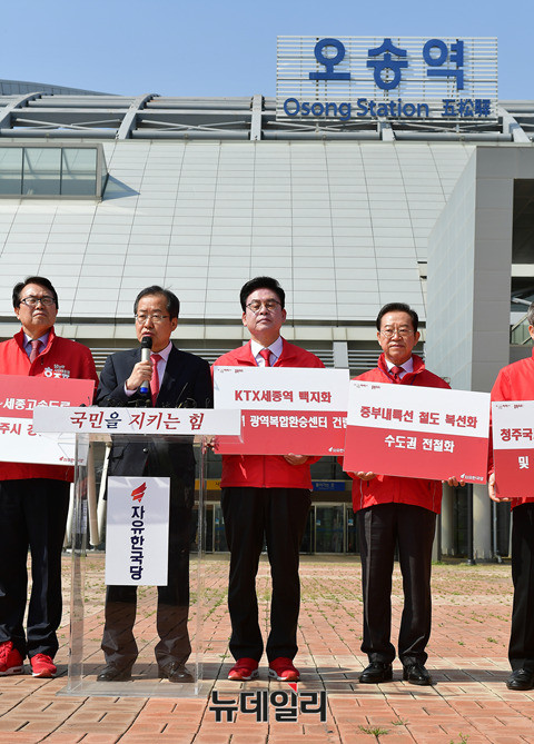 홍준표 자유한국당 대선후보가 22일 오전 충북 청주시 오송역 광장에서 충북지역 공약을 발표하고 있다. 이날 발표한 공약은 △오송역 광역복합환승센터 건립 △서울~세종고속도로 청주시 경유 △중부내륙선 철도 복선화 및 수도권 전철화 △충북 산림 휴양밸리 조성 △오송 BIO 특화단지 조성 △청주국제공항 경쟁력 강화 및 연계교통망 확충 등이다.