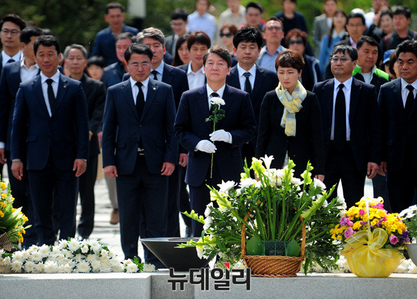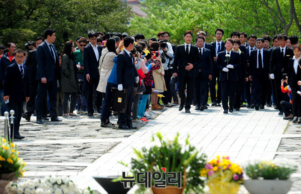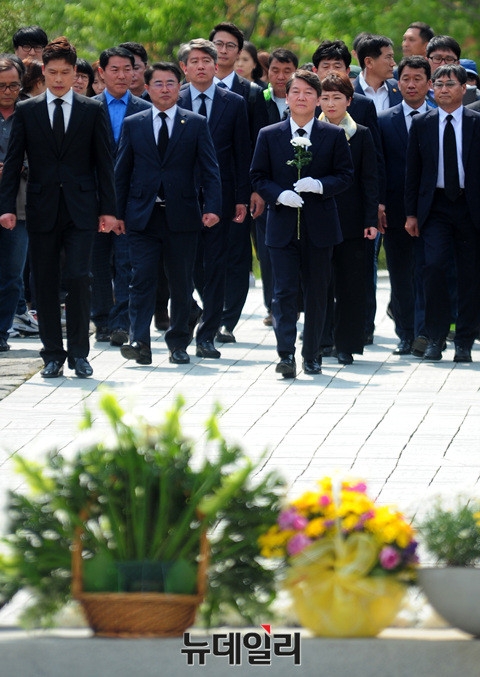 안철수 국민의당 대선후보가 22일 오후 경남 김해시 봉하마을에 위치한 노무현 전 대통령의 묘역을 참배하기 위해 입장하고 있다.