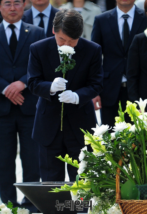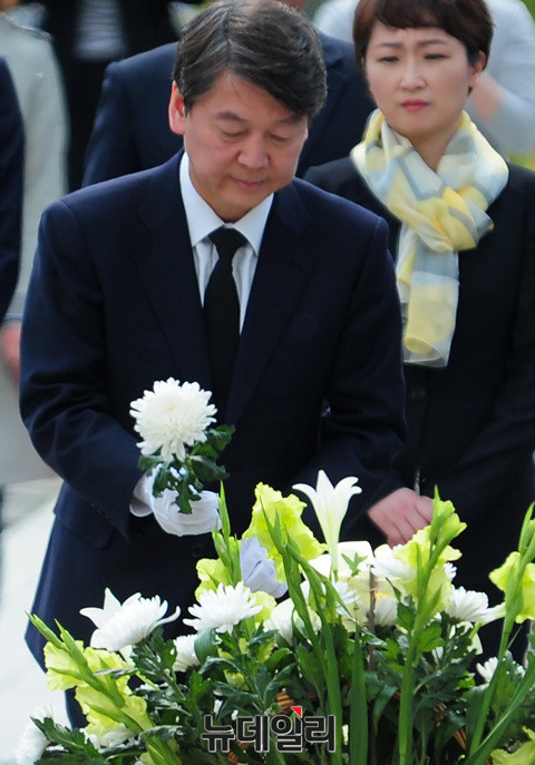 안철수 국민의당 대선후보가 22일 오후 경남 김해시 봉하마을에 위치한 노무현 전 대통령의 묘역을 찾아 헌화하고 있다.
