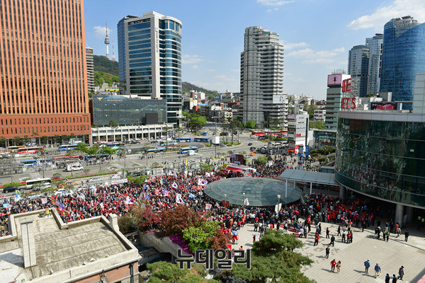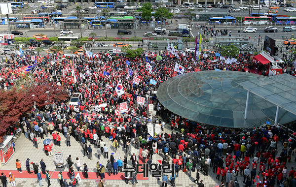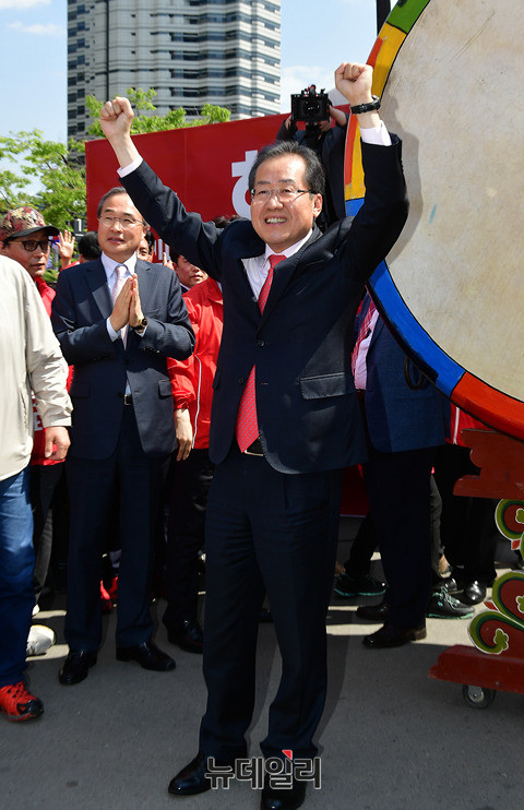 홍준표 자유한국당 대선후보가 22일 서울역 광장에서 열린 자유대한민국 수호를 위한 서울대첩 유세에서 지지를 호소하고 있다. 앞서 홍 후보는 충북 청주시 오송역을 찾아 충북지역 공약을 발표하고, 청주시 상당구를 방문해 유세를 이어갔다.