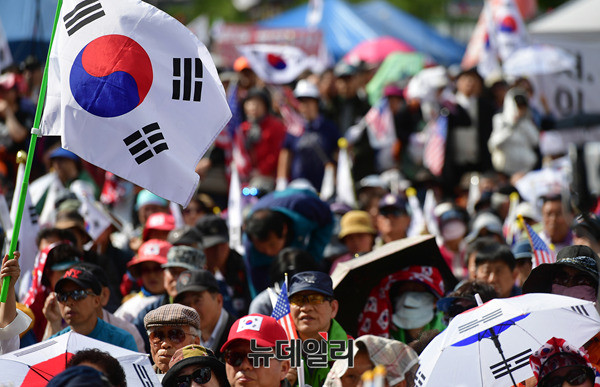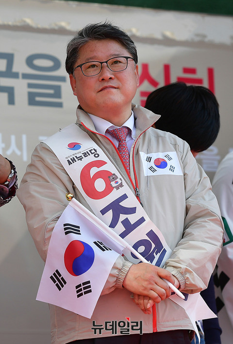 조원진 새누리당 대선후보가 22일 서울광장에서 열린 유세에서 연단에 올라 미소를 짓고 있다. 이날 태극기집회는 조 후보의 대선유세로 대체 됐다.